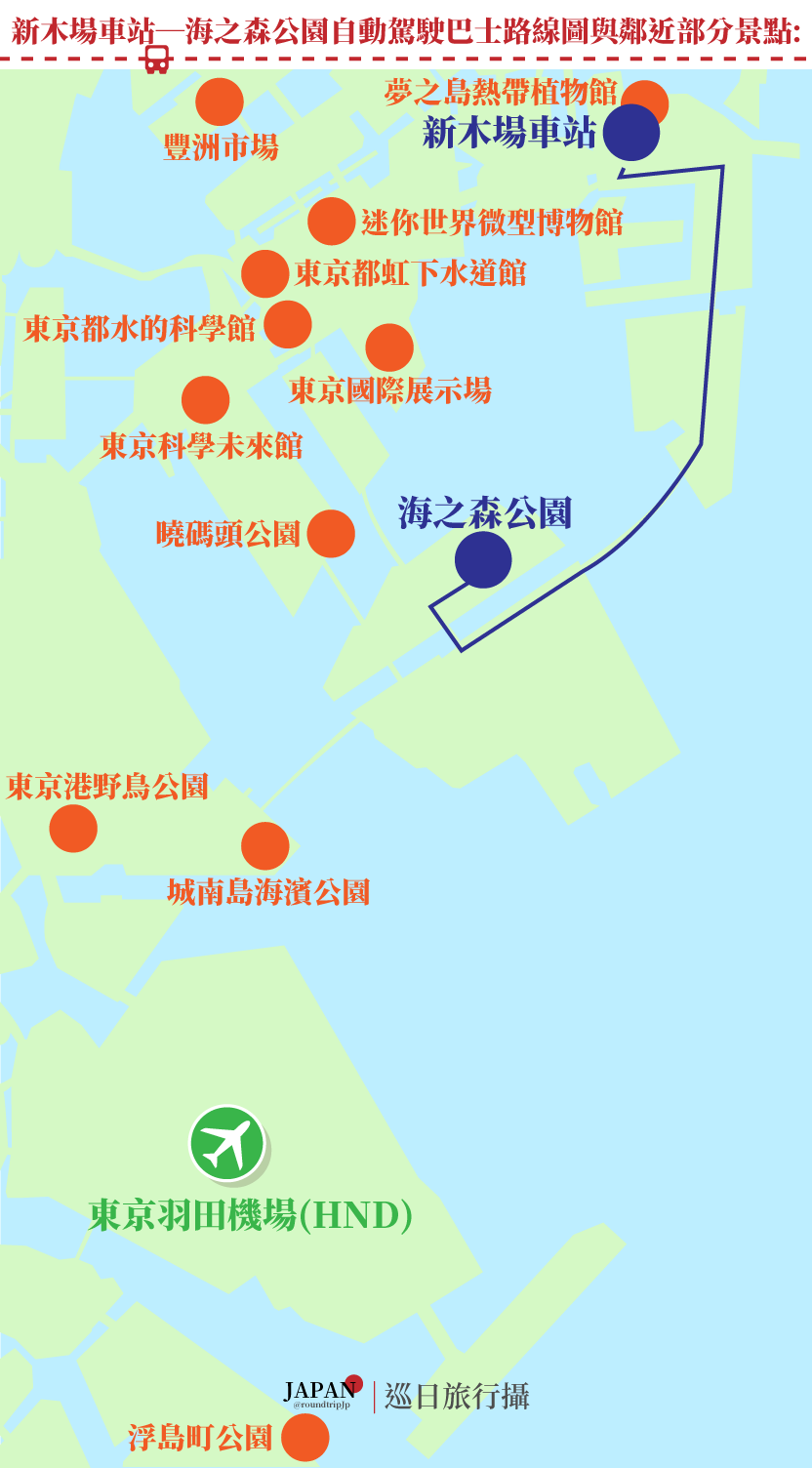 | 而在這一輛自動駕駛的巴士,是屬於迷你巴士,採用的車輛為Minibus 2.0,備有15個座位,而若是站立搭乘運用時,將可達到最多27名的載客量,更是可以免費搭乘,屬於海之森公園的免費接駁車服務! 那在運行的方式,也充滿十足的科技感,因為是一輛能自動駕駛的迷你巴士,採用自動駕駛Level2,此外為了確保安全,巴士上仍然配有駕駛,可由駕駛切換為手動駕駛! 因此在這一輛連接新木場車站─海之森公園的新穎自動駕駛迷你巴士,也是為了因應智慧東京計劃的一部分,為了提升地區交通便利性、解決駕駛員不足與交通不便者的移動支援囉! *海之森公園(海の森公園 | Uminomori Park),是於2025年3月28日開放的公園,擁有廣闊與豐富的自然風光與公園設施完善,亦是相當靠近東京國際機場(羽田機場)的公園,因此深受航空迷的喜愛,可以在此欣賞飛機之美囉! *東京港附近區域景點為夢之島熱帶植物館、豐洲市場、迷你世界微型博物館、東京都虹下水道館、東京都水的科學館、東京都國際展示場、東京科學未來館、曉碼頭公園、海之森公園、東京港野鳥公園、城南島海濱公園、浮島町公園…等等囉! ![]() 點我檢視大圖 1.新木場車站─海之森公園自動駕駛巴士的運行期間: 2025年7月1日(二)至2026年3月31日(二),年末年初不適用! 2.新木場車站─海之森公園自動駕駛巴士的運行區間: 新木場車站至海之森公園 3.新木場車站─海之森公園自動駕駛巴士的運行班次: 1日5班!(09:30、10:30、14:00、15:15、16:30) 搭乘地點:新木場車站E出入口外巴士站牌! 4.新木場車站─海之森公園自動駕駛巴士的搭乘費用: 免費,不需預約! 5.新木場車站─海之森公園自動駕駛巴士的乘車人數: 備有15個座位,而若是站立搭乘運用時,將可達最多27名的載客量! 6.新木場車站─海之森公園自動駕駛巴士的運行方式: 採用自動駕駛Level2 *此外為了確保安全,巴士上仍然配有駕駛,可由駕駛切換為手動駕駛! |
