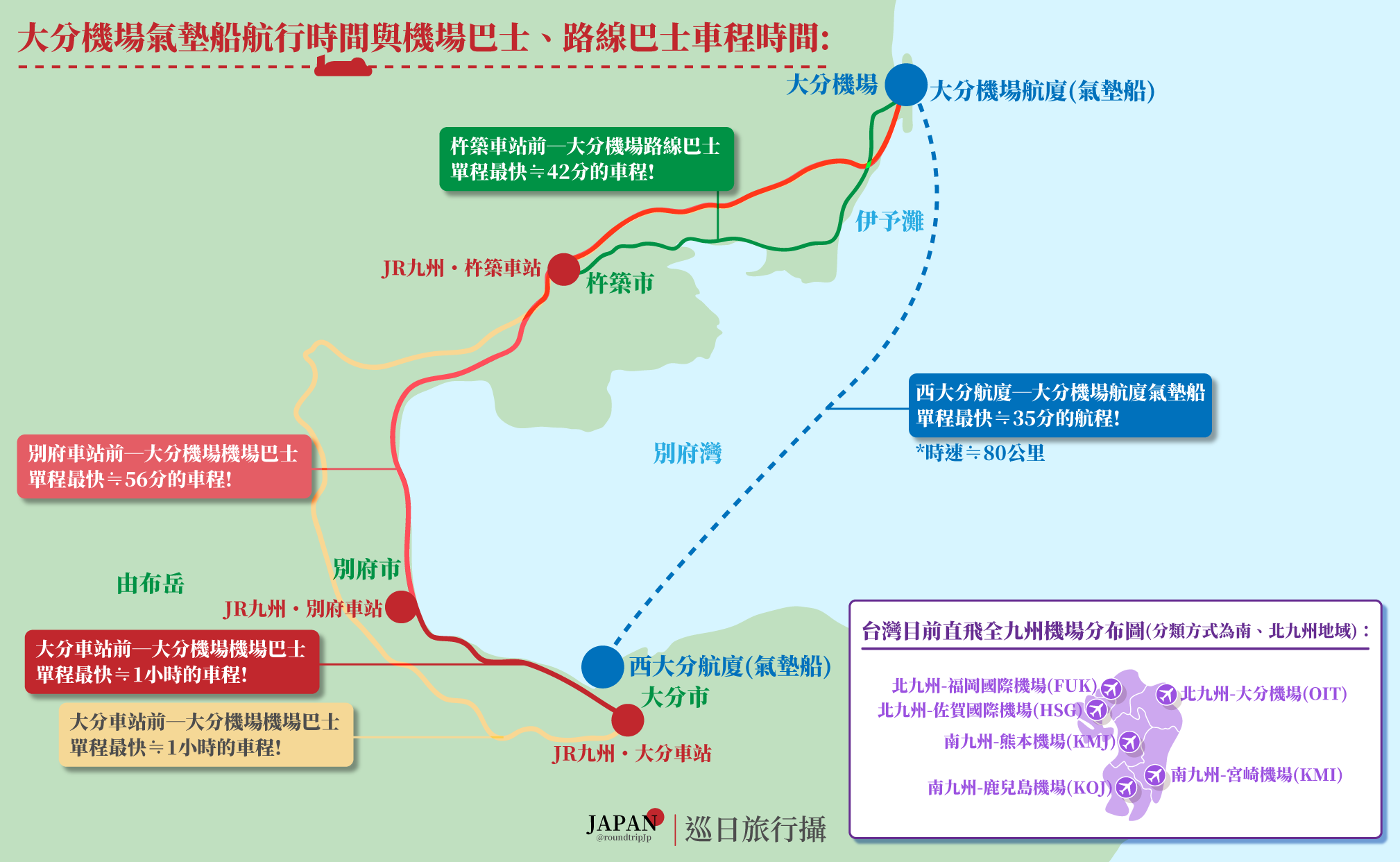 | A65 有,往返大分機場的交通方式,除了有路線巴士、機場巴士…等等之外,也有非常快速的氣墊船,因此將更方便於旅人自由選擇最適合的機場交通方式囉! 當然若是人數較多、目的地距離大分機場較近,利用計程車,也是一個相對划算與方便選擇之一囉! ![]() 點我檢視大圖 大分第一懸浮航行株式會社(大分第一ホーバードライブ株式会社),將於2025年7月26日(六),正式啟航大分機場─大分市的氣墊船定期航班(夏季船班)! *氣墊船・西大分航廈(西大分ターミナル | Hover Terminal Oita) *氣墊船・機場航廈(大分空港ターミナル | Oita Airport Terminal) |